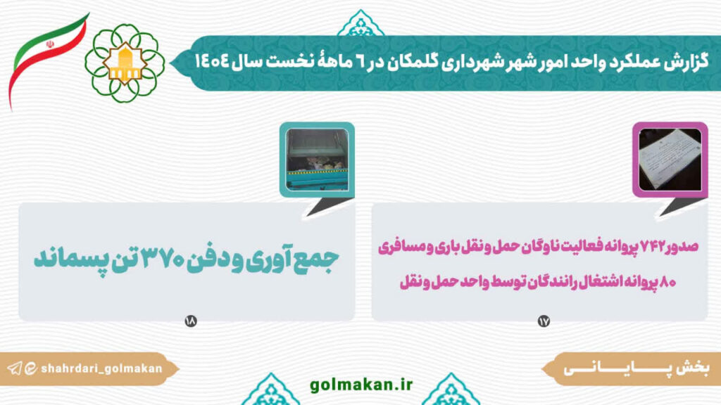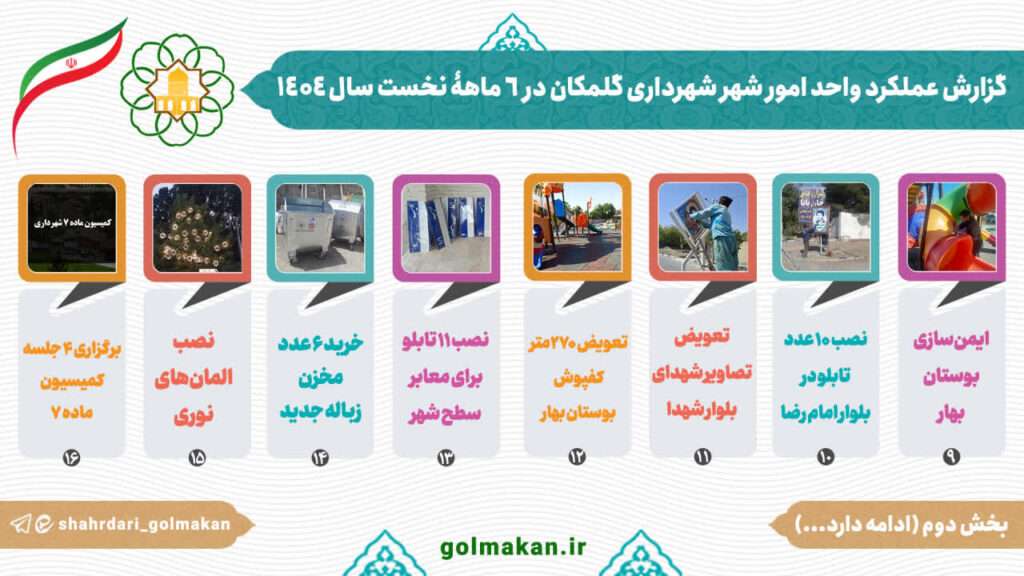 گزارش عملکرد واحد امور شهر شهرداری گلمکان در 6 ماهۀ نخست سال 1404 (بخش پایانی) واحد امور شهر شهرداری گلمکان، …